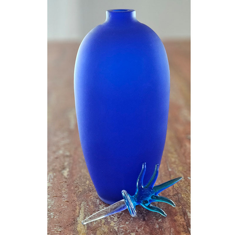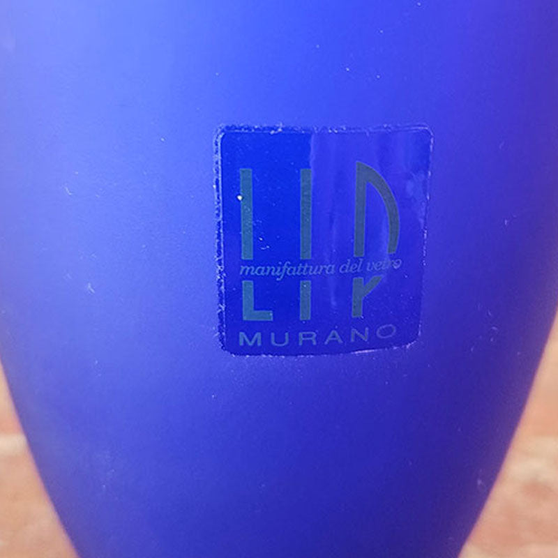 This vintage Murano glass bottle from the '90s coral reef "coralli" collection by L.I.P. Manifattura del Vetro is a true work of art, hand-blown by the talented industrial artist Marcello Furlan. The stunning frosted cobalt blue glass bottle paired with a transparent aqua glass stopper creates a striking contrast, making it a timeless and captivating piece for any art collector or design enthusiast.