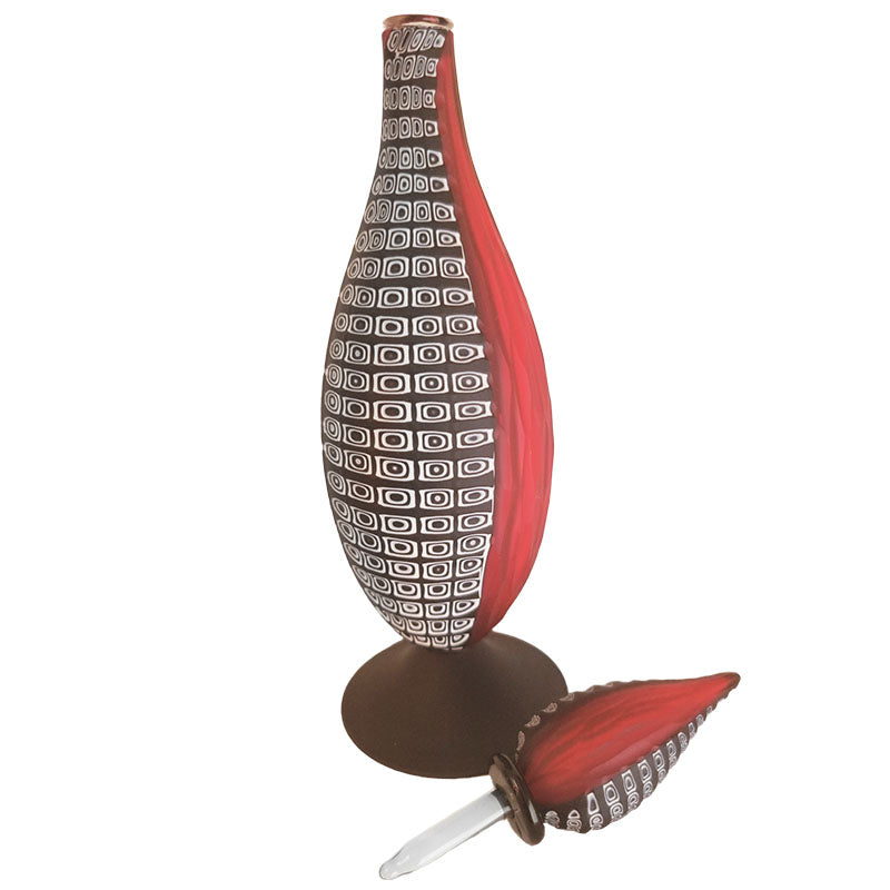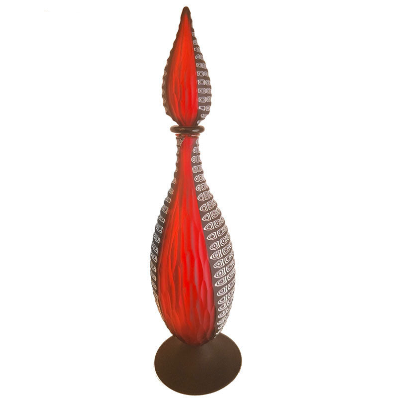 This exquisite red and black glass sculpture was meticulously handmade by a skilled glass master on the enchanting island of Murano. This stylized blown glass bottle with a stopper is a true work of art using traditional glass techniques passed down through generations. A must-have for any glass collector.
